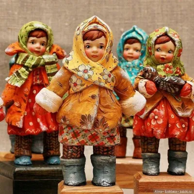 Это старинная технология использует вату и клей на основе крахмала. что самое смешное, я это умею) Вот правда, но так основательно забыла про это свое умение, что когда наткнулась в инете на этих кукол просто обалдела) я то думала, что они остались далеко-далеко в не очень богатом нашем детстве, когда игрушки на елку делали сами, просто потому, что не могли купить в магазине) А тут, оказывается целое художественное напраление живет и процветает! Конечно, жизнь внесла свои изменения - теперь лица делают из полимерной глины (а не как мы из папье маше, или просто из той же ваты, пропитывая ее клейстером, а если повезет достать, то ПВА), или расписывют готовые китайские головки, НО очарование старины все равно сохраняется!!!! Трогательные, милые, такие родные куклы! Технологи незамысловатая, вполне доступная детям. Конечно так как у профессиональных художников не получится, но и результаты новичков могут быть очень и очень милыми) Мы делали одежду из гофрированной бумаги, украшали толчеными елочными игрушками (никогда на выбрасывали разбитые)Ю гаскрашивали акварельными карандашами. Сейчас есть акриловые краски и лаки. Боже мой!!! Какие воспоминания нахлынули...запах канифоли - папа пояет гирлянду, запах мандаринов..детство и счастье)