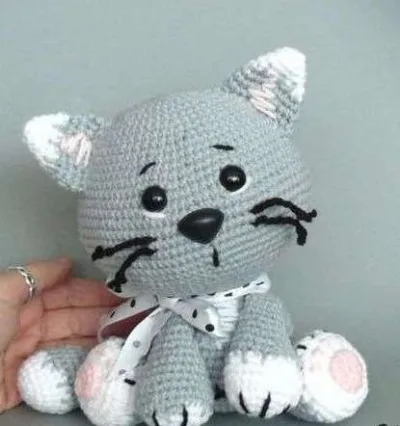 Следующий этап: сшить все части, пришить бусинки-глазки, вышить бровки, усы, когти черными нитками.