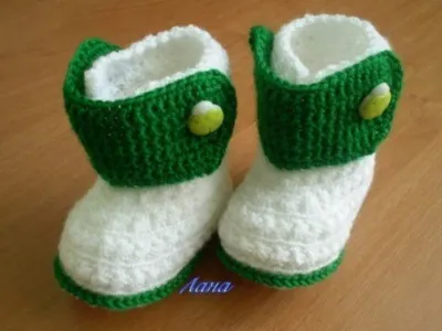 Берем нить другого цвета и присоединяем за дольки петель к сапожку