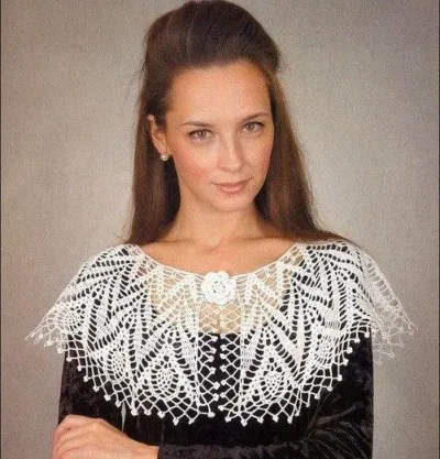 На цепочке из воздушных петель связать 1 ряд ст. б/н. Далее вязать по схеме 1, количество раппортов 15, в каждом раппорте по 15 петель. Закончив вязание пелерины, обвязать края изделия арками из воздушных петель с «пико» из 3 возд.п.