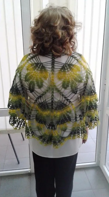 Легкая шерстяная шаль модели "Дубовые листья" выполнена крючком №3 из пряжи КАУНИ Green-Yellow 8/1. Эта шаль-накидка предназначена для ношения в качестве аксессуара на платье, блузку, водолазку. Изделие смотрится довольно нарядно благодаря цветовым переходам, посему не требует дополнительных украшений.