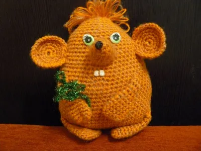 Материалы: одна ниточка оранжевая "Детская новинка" от Пехорки, 100% акрил, 200 метров в 50 граммах, вторая золотисто-коричневая - 100% акрил из сети Fix Price, 400 метров в 80 граммах. Нос и зубки снова вышиты обычными катушечными нитками, глазки приклеены на горячий клей, лапки привязаны к тельцу, а для лучшего прилегания также подклеены на горячий клей.