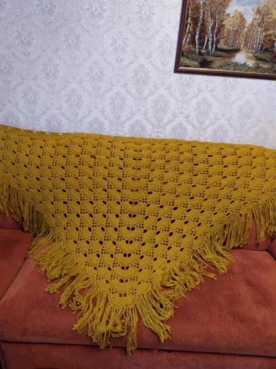Шаль связана крючком из полу шерсти в пасмах. Израсходовано 3 пасмы. В пасме 250-270 гр.