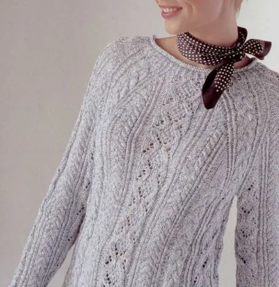 Очень красивый узорчатый пуловер, связанный спицами из светло-серой хлопковой пряжи. Полное описание и все схемы прилагаются для разных размеров.
