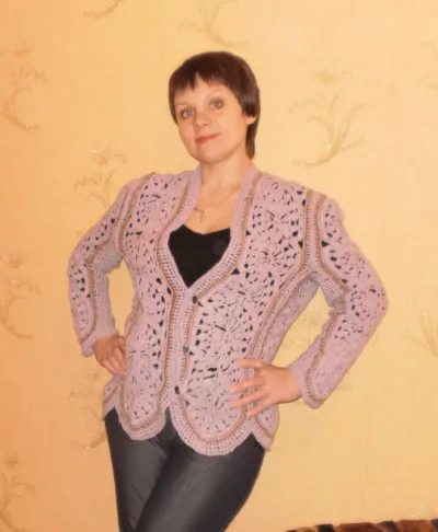Одно время увлекалась ленточным кружевом. Связала сразу несколько вещей, но потом как-то остыла . Этого жакетика уже нет. Как часто бывает у вязальщиц, поносила и распустила. Остались только старые фотографии.