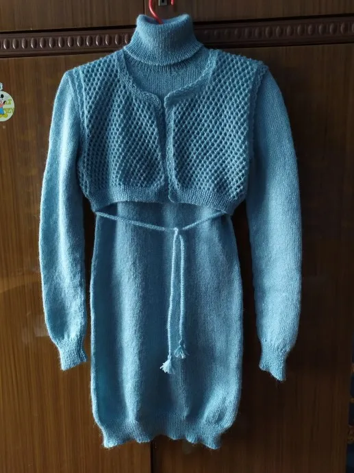 Связала платье и укороченную жилетку для жены моего старшего внука, вязала на машинке Нева-5, все резинки вязала на спицах 2,5. Жилет обвязала крючком. Нитки Angora Gold, 10% шерсть, 5% металлическая нить, 10% мохер, 75% акрил. Пошло 3,5 с небольшим мотка 100 г  500 м.