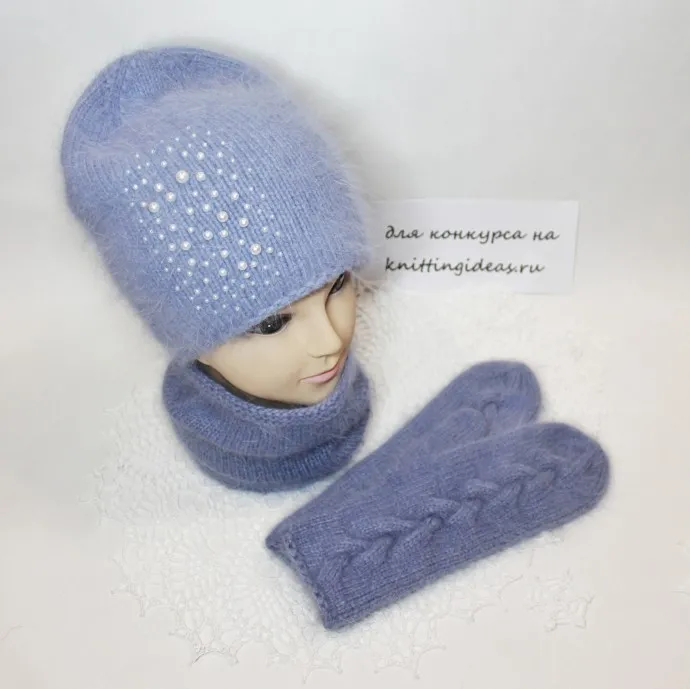 Пушистый, теплый и ооочень мягкий комплект из пуха норки для себя любимой) Ниточка совершенно не колется и приятна в носке. Использована китайская пряжа - пух норки с синей этикеткой. Пряжа очень ровная, без узелков и изъянов. Состав: 95% норка, 5% ПЭ. Дополнительная нить в комплекте на каждые 50 гр. Вязала в три нити плюс две дополнительные (идут в комплекте) спицами № 3,5. Расход пряжи почти четыре моточка по 50 г. Во время работы пух лезет очень сильно, но после первой стирки перестает и почти не сыпется, лишь единичные ворсинки. Вязала по МК Ольги Макшеевой.