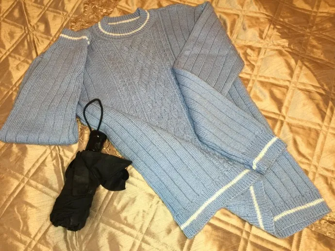 Связала супругу джемперок, пряжа акрил, спицы 2мм. Спереди араны, сам джемпер вязала резинкой 4х4, изюминка - полоски белым цветом. Вязала с низу к пройме по кругу, далее делила на перед и спинку. после чего вывязывала втачной рукав и горловину.