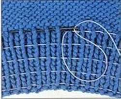 У резинки 1 х 1 проложите нить с изнаночной стороны с равными промежутками через половинки всех петель. Привяжите нить к кромочной петле или прикрепите ко шву.