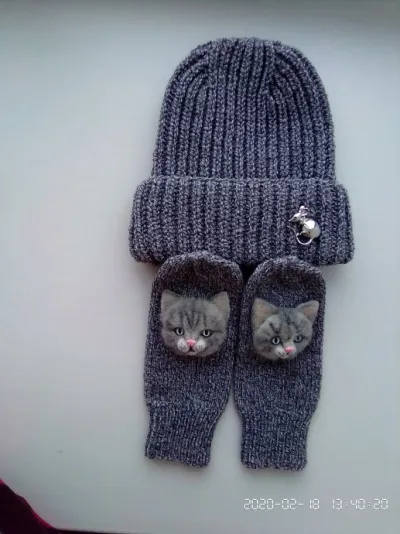 Добрый день! Запоздалый подарок для невестки, уже зима заканчивается, но думаю успеет поносить. Мордочки кошечек валяные, но это не моя работа. Я их покупал, так как с валянием не дружу. Комплект свзяниз ALIZE LANAGOLD. Думаю что , комплект будет теплым.