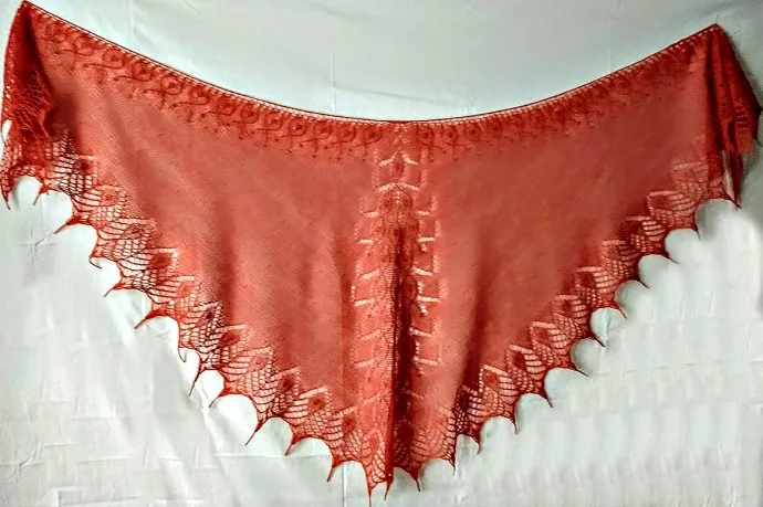 Закончила тестирование шали "Перо волшебной птицы" дизайнера Аллы Борисовой в ее группе в ВК. Мне она увиделась в оранжево-огненном цвете, поэтому и выбрала соответствующую пряжу. Несколько дней у нас солнышко было, а как только мне понадобилось сфотографировать шаль для отчета - снег с дождем пошел. Но отчет откладывать нельзя, поэтому фотографии получились не очень.