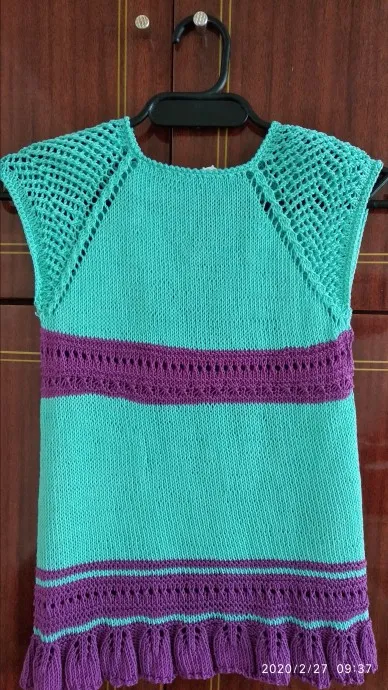 Связала внучке на 8 марта. Пряжа Пехорка летняя, 330 м в 100 граммах, спицы 2. Бирюзовая использована практически полностью. На платье не хватило бы, поэтому добавила фиолетовую пряжу. Платье на возраст 4-5 лет.