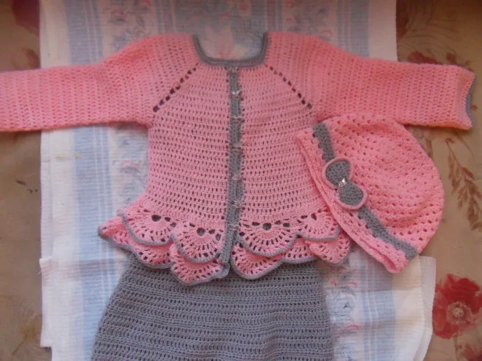 Любит моя младшая как и все девочки розовый цвет. А мне понравилось такое сочетание серый - розовый. Костюм в детский сад. Схемы кому интересно прилагаю. А сарафан вязан просто: верх резинка, низ столбики с накидом.