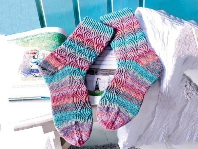 Красивые носки, связанные на спицах узором «ракушки», очень эффектно выглядят в варианте меланжевой пряжи.