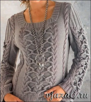 Модный джемпер с косами и жгутами вязаный спицами - красиво, тепло, удобно! Размеры джемпера: 34/36 – (Р1), 38/40 - (Р2), 42/44 - (Р3), 46/48 – (Р4), 50/52 - (Р5)