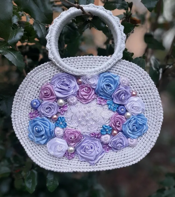 Сумочка из полиэтиленовых пакетов,связана крючком,украшена цветами из атласных лент,бусинами,по центру и по краю проложила регилин,что бы держала форму.Ручки -обвязаные пяльца,застежка молния,есть внутренний кормашек.