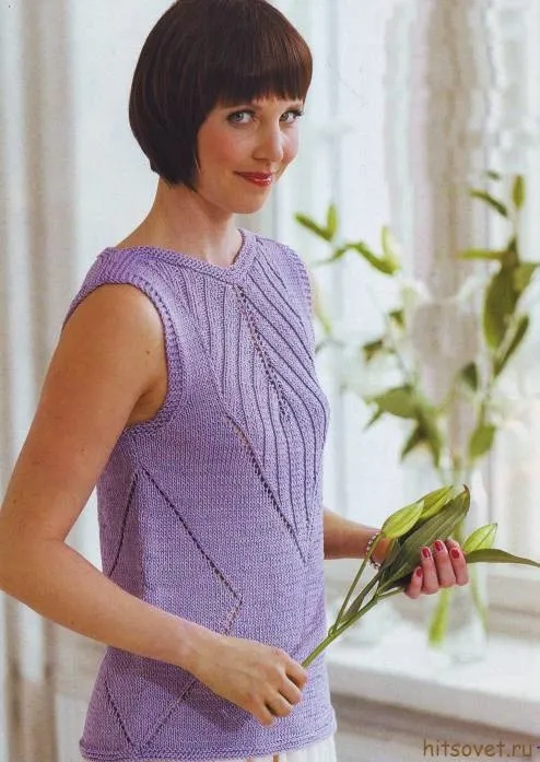 Сиреневый топ с описанием и схемой – Вам потребуется: пряжа Novita Kaste (85 % хлопок, 15 % вискоза, 196 м на 100 г) – 300 (350) 400 (450) г сиреневого цвета (741), спицы №4.