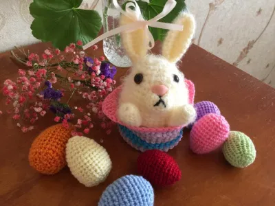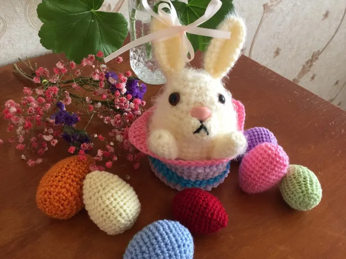 К празднику Паска, связала пасхального кролика, в подарок. Вязала из остатков пряжи, крючок 2,5мм.
