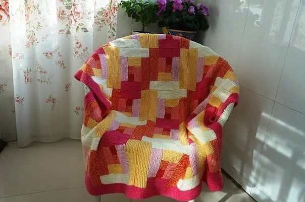 Сначала вяжут прямоугольник таким образом набирают 8 петель, вязать квадрат ниткой одного цвета. Затем сменив цвет нити, провязать столько же. Затем набирают петли по боковому краю связанного и вяжут поперек первой полоски.Таким образом надвязывают полосы по всему периметру прямоугольника. Когда прямоугольник достигнет нужной величины. петли по краям закрывают.Связать таким образом несколько прямоугольников, запрятать края нитокс изнанки в вязание и соединить прямоугольники, закрепить и сшить их в одно полотно. Край пледа также обвязать платочной вязкой.