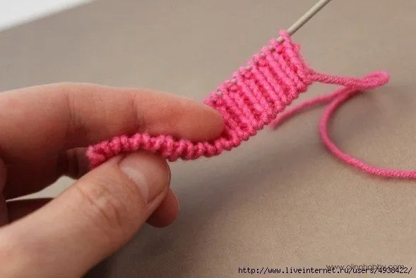 Кромочную снять. Следующая петля - изнаночная. Затем поднять петлю из протяжки 1-го ряда, надеть ее на левую спицу и провязать лицевой. Следующая петля - снова изнаночная (она уже есть на спице). Снова поднять петлю из протяжки 1-го ряда и провязать ее лицевой.
