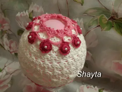 Для вязания шапочки потребовалось: меньше моточка АЛИЗЕ Дива, остатки ИРИСА, крючок № 1,6; 10 бусин.Вязала по этой схеме (от кофточки) вкруговую, снизу вверх.Верхушку можно оформить по разному… Набираем 162 в. п. и вяжем по схеме. Для убавления макушки: убавлять можно и в рядах с узором, где есть цепочка из возд.петель — по одной в элементе,в каждом ряду, далее вяжем несколько рядов (их у меня 3) арочки из 5 в.п.,а затем, в процессе убавляем также — на одну в каждом ряду. Для оформления макушки набираем другой нитью и вяжем по второй схеме.Далее нужно связать 10 элементов «ягодка» и обвязать её арочками из 4 в.п. Пришить их, а затем бусины.Край шапочки обвязываем арочками из 4 в.п.