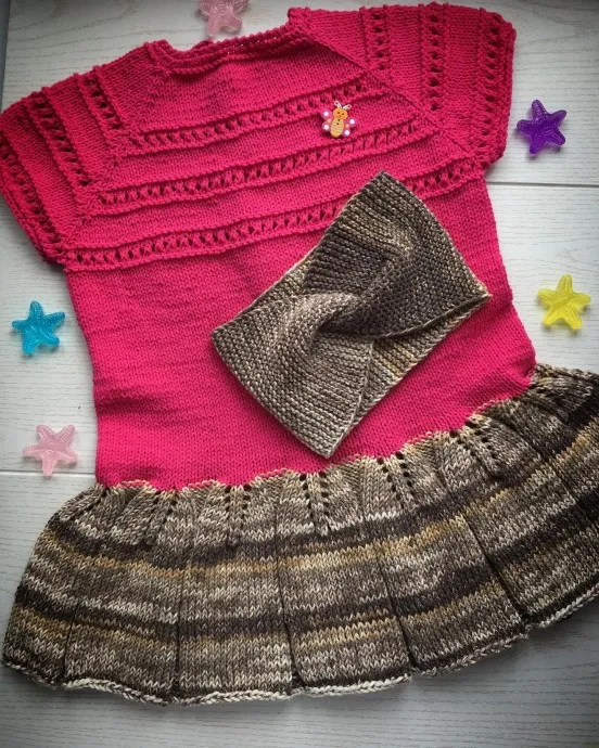 Довязала я платье для внучки и повязку на голову. Пряжа цвета фуксии ушло чуть меньше моточка. Пряжа коттон голд от Ализе. В 100 гр 330 метров, 55% хлопок, 45 % акрил. спицы 3. И ещё моточек пряжи меланжевой от Нако Калико Жакар в 100 гр 245 метров, состав 50/50 акрил с хлопком. Изделие без ВТО, не судите строго)))