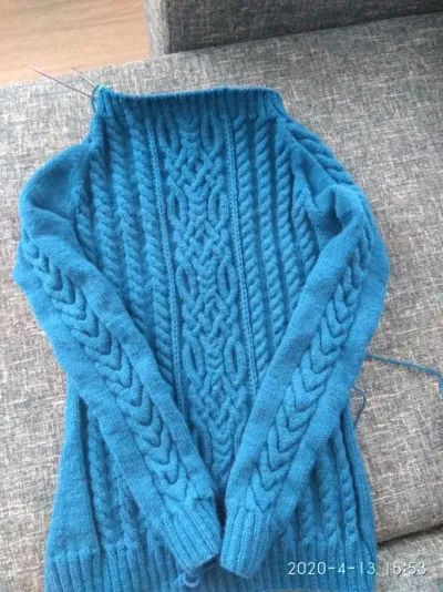 О, какой красивый свитер: косы, араны, цвет ИзЮмительный. К этой модели нужен 1- высокий ворот с отворотом (у вас низ длинный и будет отлично смотреться) или 2-обычный 3-4 см, но уже, чем вы сейчас связали. Можно сделать его двойным и закрыть с лица кетельным швом. Удачи!!! Вы умница, осталось чуть-чуть и шедевр готов…