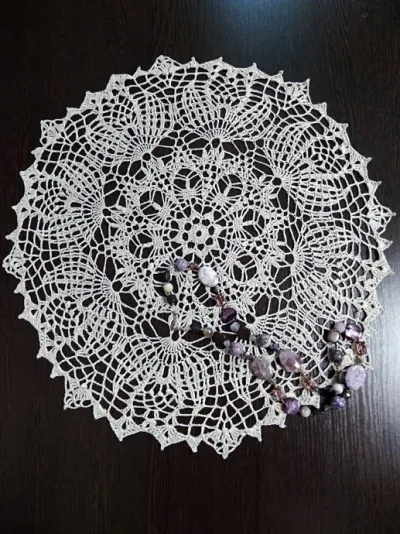 Давно хотела связать салфетку. Но все были более серьезные проекты. Недавно на нашем сайте был выложен пост салфеток со схемами от Лидии,салфетки одна другой краше, очень понравились.Выбрала эту - ажурную,воздушную. Связала быстро, вечерами у телевизора, подхода за 3. Пряжа Виола с сайта "Все нитки", производитель ПНК Кирова, 30% лен, 40% вискоза, 30% хлопок, 150 м / 25 г., цвет суровый. Ушло около полутора клубочков, диаметр салфетки 50 см. Накрахмалила слегка, и, вуаля - любуемся. Вот думаю теперь, что с этим фантом сделать: подарить, продать или оставить себе?