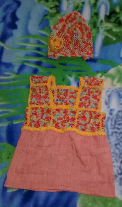 Давно хотела реализовать какую-нибудь модель, где совмещается вязание и ткань. Это первый опыт. Вязаная часть из квадратов, к ним пришита пола из марлёвки. Ну, и шапочка в дополнение. Пряжа Alpina, арт. Katrin, 100% мерсеризованный хлопок.