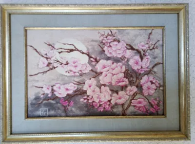 Кроме вязания я очень люблю шить, вышивать крестиком, лентами, делать папертоль, работы в технике скраббукинг и прочее. Вот эта картина Цветущая сакура вышивалась прошлой весной, год ждала подходящей окантовки, дождалась.