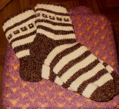 У нас похолодало. Зимы, как таковой, не было. И похоже, что и лето не торопится. На даче много всякого барахла, чтобы утеплиться, но зачем утепляться барахлом, когда можно связать что-то новое. В данный момент таким новым и востебованным оказались обыкновенные носки. Связала их из остатков пряжи. Использовала, шерсть, полушерсть и пять спиц. пока связала только себе. Муж тоже просит, так что процесс, можно сказать, пошел
