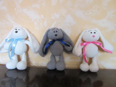 Вот решила показать вам, каких зайцев связала для своих внучат. Вязала их крючком №4 из пряжи Alize Cotton Gold plus