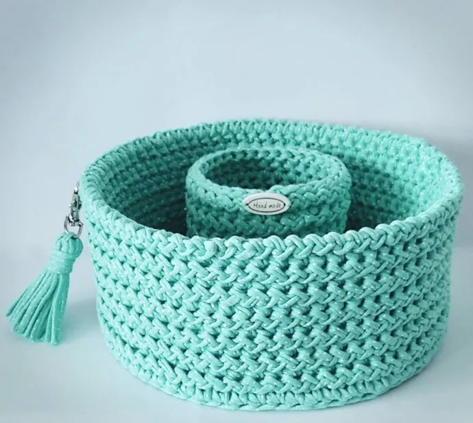 Две корзины связаны в одном стиле из трикотажной пряжи за 4 дня. Диаметр маленькой корзинки 10 см, высота 8 см. Диаметр большой - 20 см, высота 9 см.
