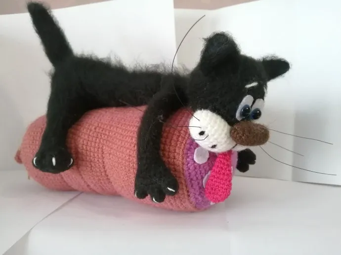 Совсем недавно увлеклась вязанием игрушек крючком и втянулась. Этот кот один из первых моих серьёзных и кропотливых для меня работ. Но результат мне понравился, потом повторю обязательно. Вязала из остатков ниток, состав точно не помню. Кота из шерсти с акрилом, смогла начесать потом. Колбасу из каких ниток- фото прикрепила. В работе нитки понравились. Связала по просьбе мужа для его друга.. Мужу понравился кот! Надеюсь, что и другу тоже