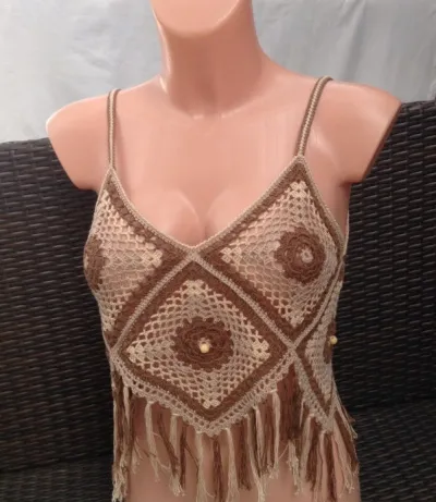 Летний кроп-топ связан мотивами крючком.Вязала из пряжи трех цветов VITA Cotton (Индия),100% мерсеризованный хлопок.240м/50г.Крючок 1,25.Расход 180г.Размер 44-46.Топик украшен бусинами и оформлен бахромой.