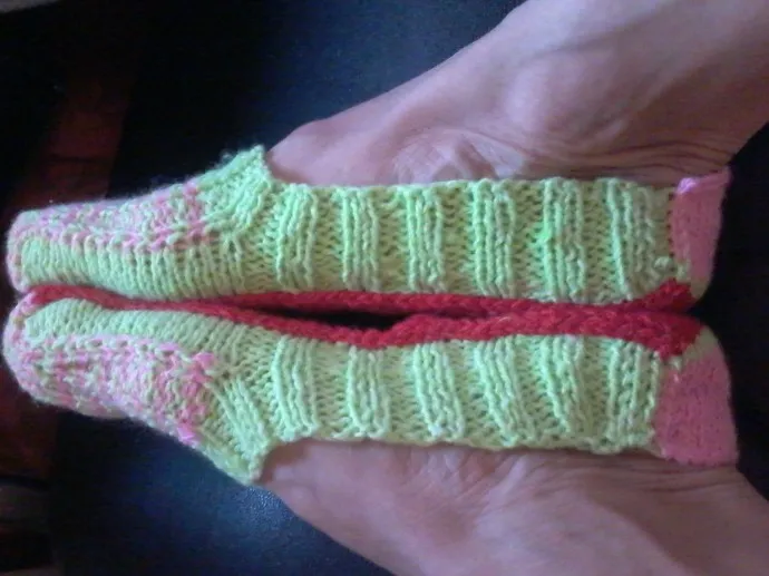 Эти домашние тапочки связаны мной в дни карантина, когда еще погода стояла хмурая. Решила добавить оптимизма себе и сестре. Использовала для верхней части нежно-розовый и салатовый цвета, а для подошвы - красный. Особого тепла уже не требуется, потому пряжа взята акриловая.