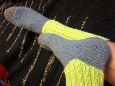 Люблю удлиненные манжеты на носках, но не гольфы - и вот они, носки на мой вкус. Манжеты - из акрила, далее - полушерсть, и самый конец мыса утеплен при помощи добавления шерстяной пряжи. Для того. чтобы не мерзли пальцы ног, если что.