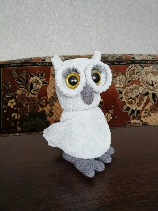 Сова рост 23 см, связана из гималай,цвет серебристый, голова поворачивается на 360 градусов.