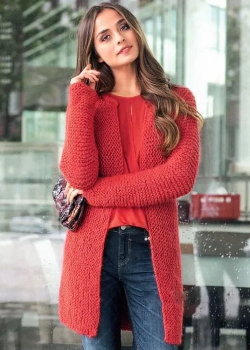 Пряжа (50% натуральной шерсти, 50% полиакрила; 100 м/100 г) 8 (9) мотков красной; спицы №8 и №9.