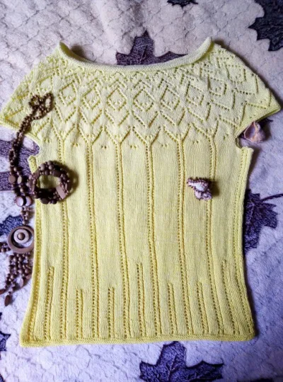 Закрыть петли рукавов, вместо них набрать по 18 воздушных п на местах проймы. Итого 240п = 16 раппортов основного узора (15п).