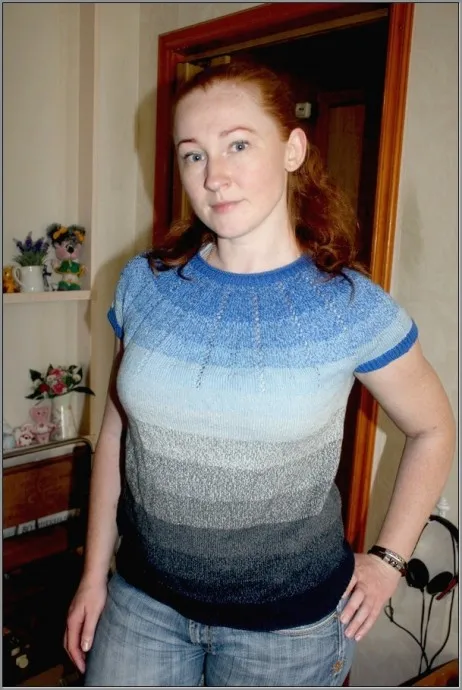 Спасибо! Топик совсем простой, но ниточка очень симпатичная… Очень много разных красивых расцветочек у этой пряжи, но дочка выбирала под джинсовый стиль…
