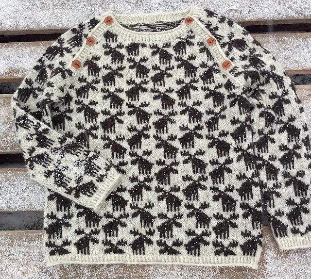 Ух! Сколько олешков! Какая красота получилась! Горловина и резиночки на рукавах и по низу мне очень понравились! Имитация застежки (я думаю, что имитация) придумана как изюминка? Мне кажется, что он очень нежный, мягкий, легкий и уютный, а жаккард просто бесподобен! В схеме нет глазика, а на изделии олени глазастые — супер! Спасибо большое за идею!