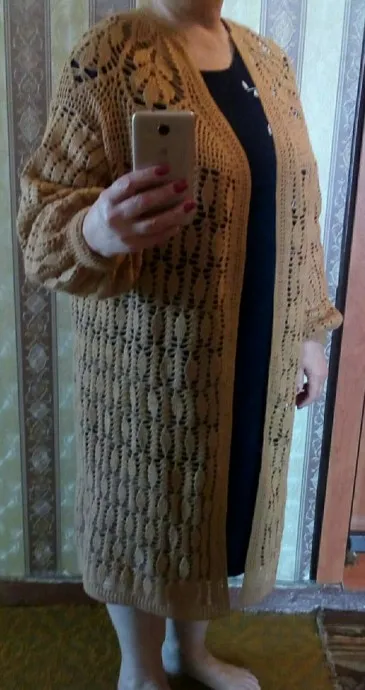 Хотелось связать летнее пальто. Вот что у меня получилось.Вязала крючком номер 1.5, нитка тоже "пехорка". Удобная вещь в прохладную погоду. Ниток ушло 8 мотков, в мотке 400 метров, 100 граммов. Начинала вязать с горловины кокетки и продолжала в низ.