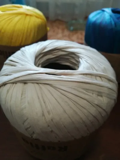 На комплект ушло 5 мотков рафии 40 гр - длина нити 90 м., на большую шляпу 3 мотка по 90 м.