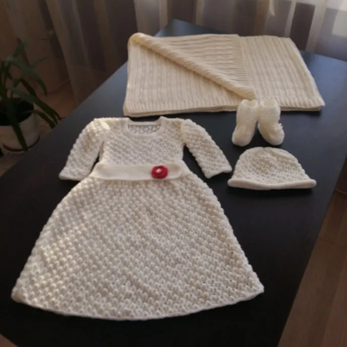 Крестильное платье для моей маленькой принцессы (внученьки) выполнено спицами из тонкой микрофибры (очень мягкой и нежной на ощупь). Пряжа произведена в Турции - Alize diva baby. Поясок украшен цветком (связан крючком). В комплект к нему связаны шляпка и пинетки. И завершает комплект плед, связанный из хлопка.