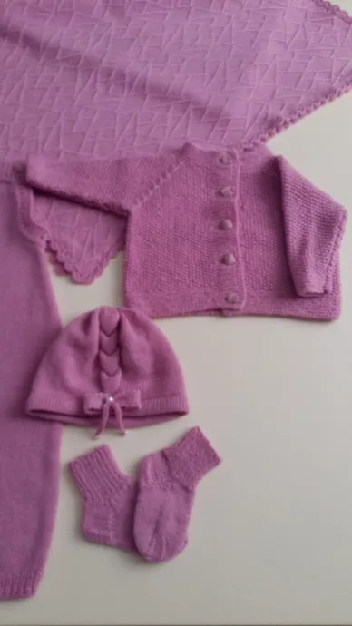 Этот комплект состоит из пледа, шапочки, комбинезончика (связаны на вязальной машине) и кофточки с носочками (связаны спицами). Шапочка украшена бантиком с бусинами. Кофточка связана регланом сверху. Комбинезончик на пуговках в шаговом шве.