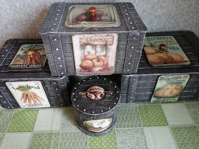 Здравствуйте, дорогие мастерицы. Сегодня хочу поделиться с вами идеей создания органайзеров для хранения овощей. Многие знают, что я не использую супер дорогих материалов, а просто пускаю хлам в дело. Этот раз не исключение, работа выполнена из обычных картонных коробок. Все покрыто лаком, внутри самоклейка, так что можно спокойно их протирать. Они довольно вместительные (картошки помещается целое ведро). Приятного всем просмотра и хорошего настроения. Контейнеры оставлю себе (на день рождения).Они так хорошо смотрятся у меня в кухне. Результатом я осталась довольна.