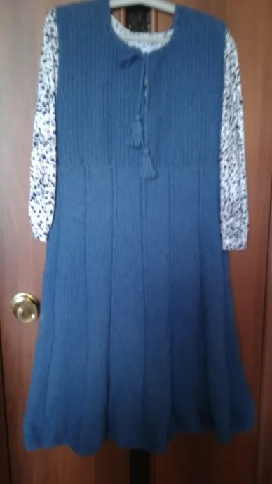 Сидя на карантине, связала теплый сарафан из кавказской пряжи цвета джинсы. Давно собиралась.Ушло на изделие 700 гр.Спицы №3. В вязании использовала лицевую гладь,косы из двух петель,и путанку (чередование лицевой и изнаночной).Горловина обвязана крючком №3 столбиками с накидом,которые чередуются с воздушной петлей.Завязки - цепочка из воздушных петель,на концах кисточки.