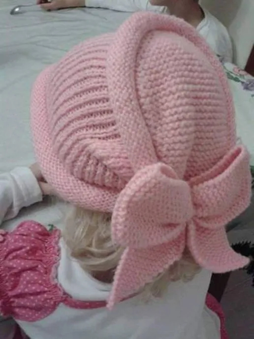 Заложить 3-ю деталь бантом и пришить её к заднему шву шапки.