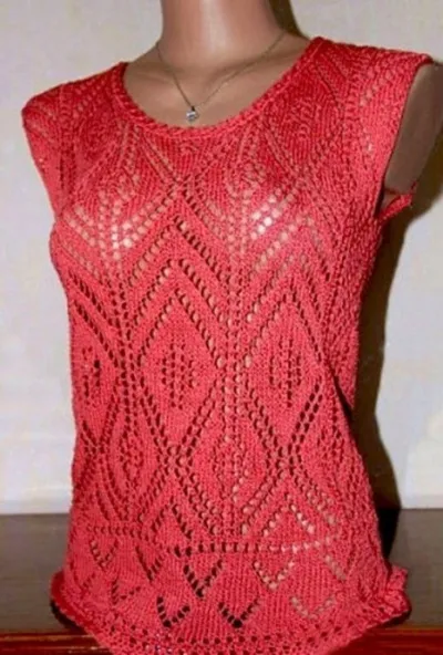 Для выреза горловины через 54 см = 138 р. от изн. глади закрыть средние 31 п. и обе стороны закончить раздельно.